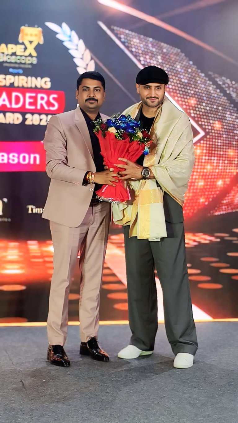 Indian cricketer Padma Shri Mr. Harbhajan Singh honored the young entrepreneur Mr. Rakesh Rathod from Maharashtra with the Inspiring Leaders Award 2025 at Ginger Hotel Andheri.